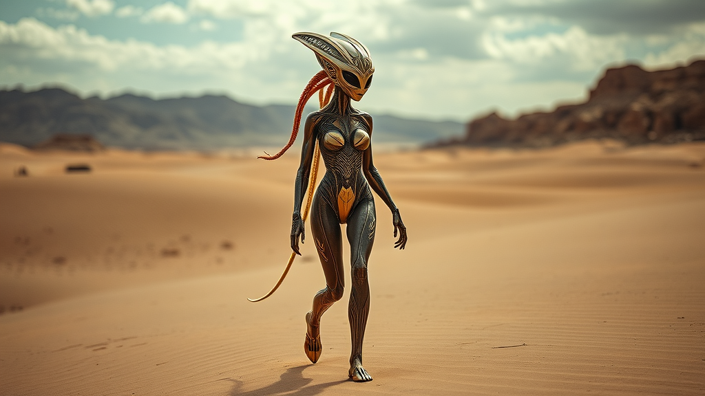 alien being traversing a desert landscape, futuristic elegance in dark beige and gold hues, low depth of field capturing solarpunk essence, surrealistic poses under vast skies, captivating presence; alien woman in majestic desert walk, echoes of intricate spacecraft design, meticulous detail in form, craola inspired, shimmering in light bronze and gold, lifelike representation