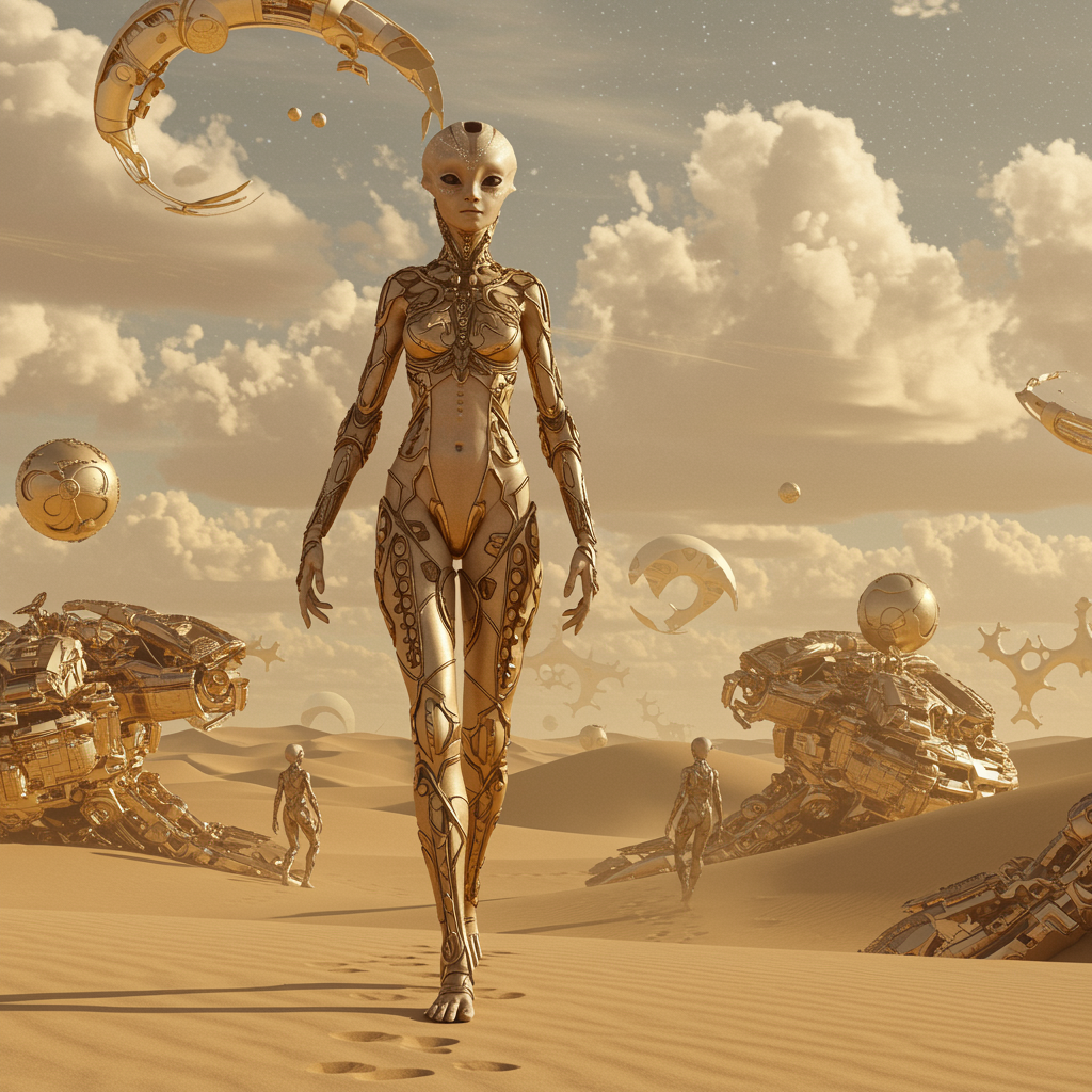 Alien being traversing a sunlit desert landscape, infused with futuristic glamour and adorned in dark beige and shimmering gold hues. The scene captures a solarpunk aesthetic with surrealistic poses against expansive, cloud-dotted skies. The focus is on the captivating figure of an alien woman meandering through the sand, her presence reminiscent of intricate and elaborate spacecraft designs. The environment brims with intricate details, set in a light bronze and gold palette, showcasing realistic, finely detailed figures as they navigate this breathtaking, otherworldly terrain.