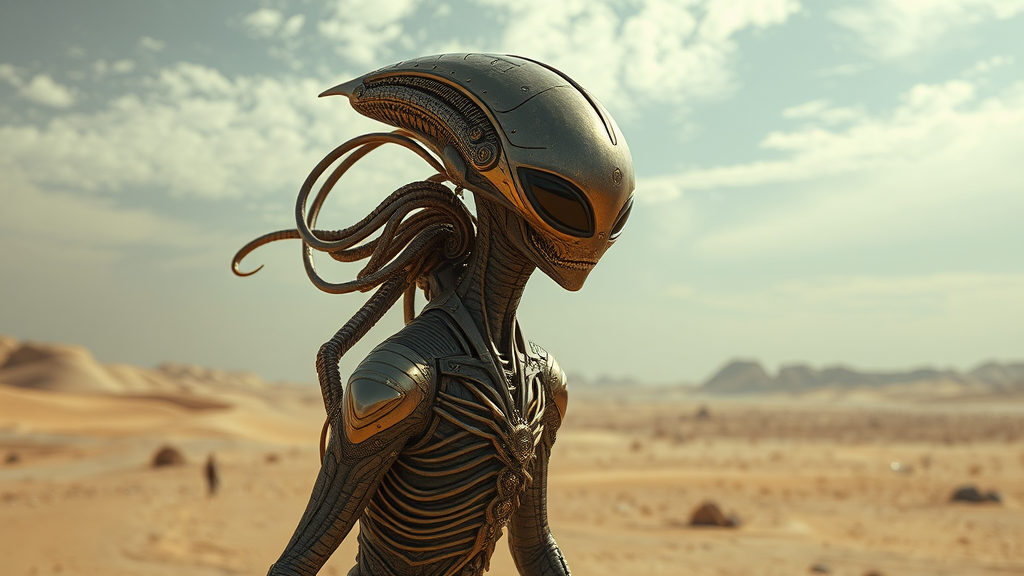 "Alien being traversing an arid landscape, infused with futuristic elegance in dark beige and shimmering gold hues. With a solarpunk aesthetic, expansive skies stretch overhead, casting a surreal and captivating ambiance. This alien figure embodies a blend of extraterrestrial beauty and craftsmanship reminiscent of intricate spacecrafts. The setting features a low depth of field, highlighting the detailed and realistic qualities of the figure, which is styled with hints of light bronze and gold. The scene portrays a mesmerizing fusion of artistry akin to craola, capturing the essence of an otherworldly journey through the desert."