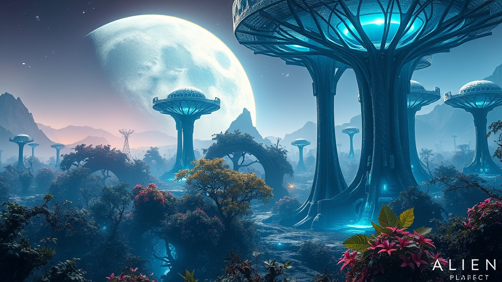 Alien civilization, vibrant flora and fauna, ethereal blue-skinned beings, moonscape forests, luminescent landscapes, cinematic style inspired by James Cameron, extra-terrestrial exploration, towering alien trees, harmonious connection with nature, imaginative futuristic ecosystem, awe-inspiring vistas, narrative depth, science fiction adventure, mystical planet, otherworldly beauty, atmospheric perspective, cinematic storytelling elements.