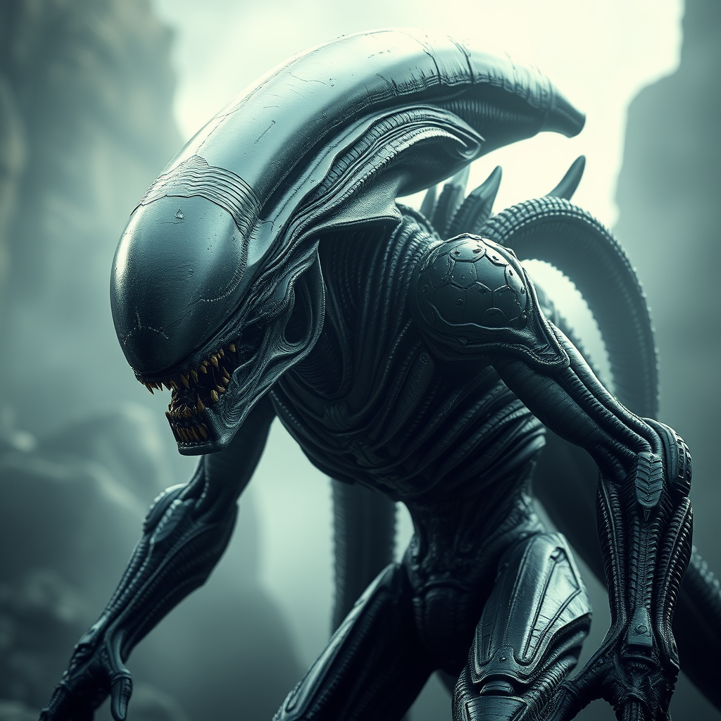 Alien creature, imposing and fearsome, with a daunting presence that exudes menace, complete with intricate textures and details that make its form strikingly realistic, standing tall and dominating the scene, embodying a sense of raw power and intelligence, with features both otherworldly and unsettling, set in an elongated aspect ratio of 68:128, imbued with artistic flair and refinement.