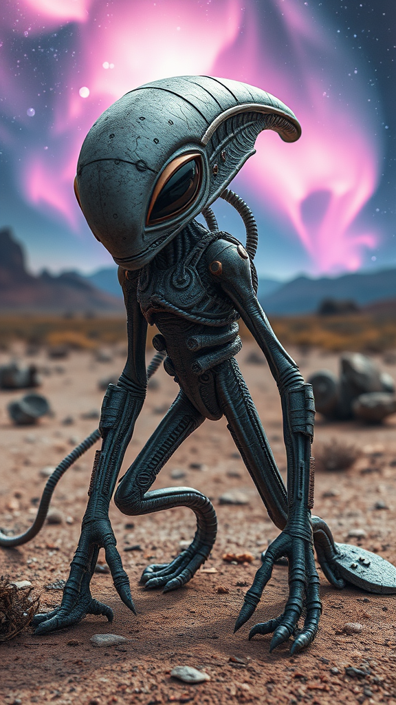 Alien creature in arid tundra art hd, in the style of avant-garde luxury, weathered gray and copper, high depth of field, steampunk, geometric poses, vast auroral skies, mesmerizing.