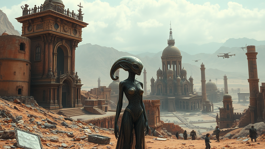 Alien creature in desert art hd, in the style of dark opulence, rich terracotta and bronze, high depth of field, steampunk, sharply defined poses, expansive skies, ethereal, an alien woman standing amidst an ancient, abandoned cityscape, in the style of intricately detailed clockwork machinery, detailed figures, multifaceted metallic and bronze surfaces, futuristic concept of ancient ruins.