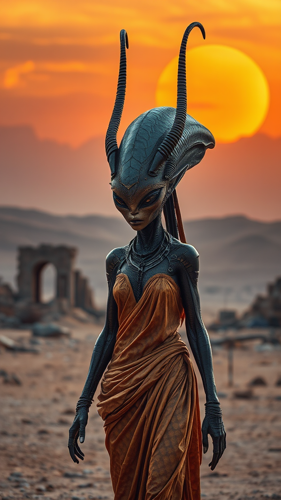 Alien creature in desert art hd, in the style of futuristic mystique, dark sienna and copper, high contrast, solarpunk, dreamlike poses, expansive twilight skies, captivating textured scales, elaborate antennae headdress, low-key lit folds in golden robes, realistic physiology, an alien woman walking in the desert, amidst old-world ruins, in the style of diesel punk spacecrafts, highly detailed biomechanical features, layered depth of field, light rust and gold, glinting with microscopic circuitry.