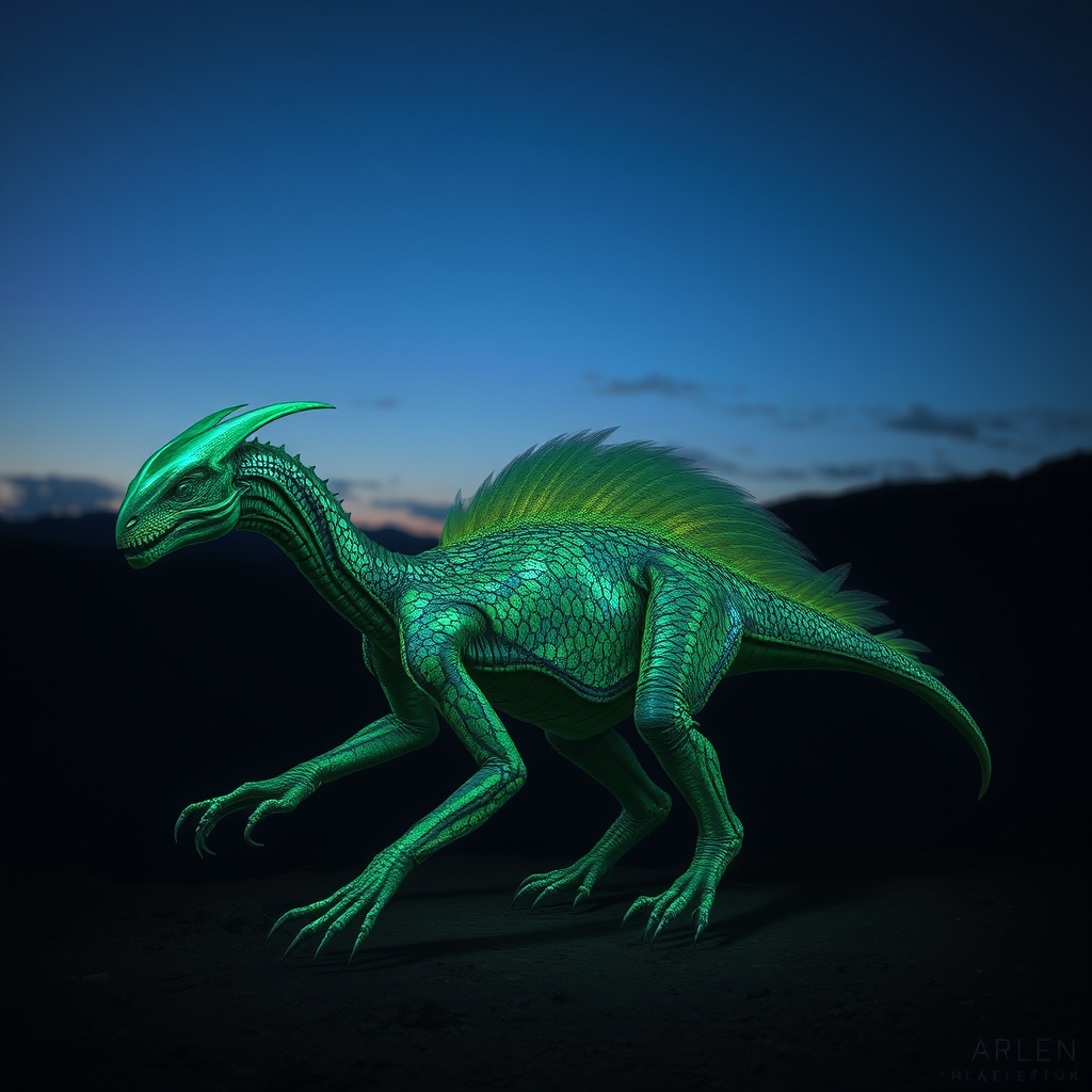 Alien creature resembling a dinosaur, with elongated limbs and bioluminescent scales, inhabiting a surreal landscape under a twilight sky; features a hybrid anatomy with feather-like appendages, intricate patterns on its skin shimmering in hues of emerald and sapphire, evoking an otherworldly presence in a raw, unrefined environment.
