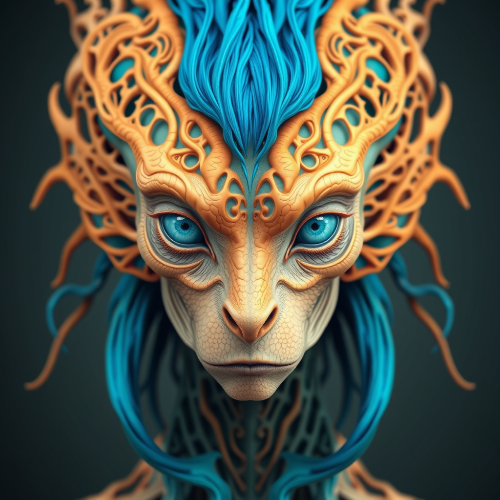 Alien creature with striking blue hair, inspired by Theo El, rendered in a balanced symmetrical design using light orange and cyan hues. The portrait emphasizes detailed facial features, merging the essence of a manticore with intricate, organic forms. Employing muted tones, the artwork showcases meticulous portraiture with complex, interwoven patterns. The orientation is vertical, enhancing the surreal, ethereal quality of the being.