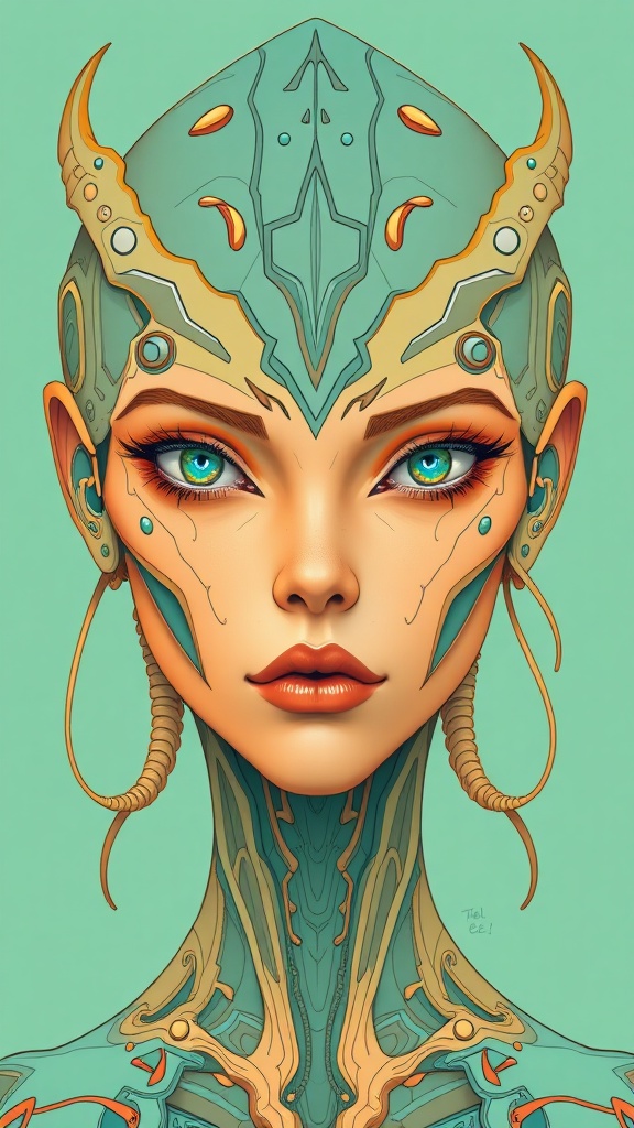 Alien cyborg female illustration by Theo El, featuring symmetrical balance, light orange and cyan hues, intricate facial features, manticore elements, organic forms, muted tones, precise portraiture, and elaborate patterns, with subtle creative variations to enhance the original concept.