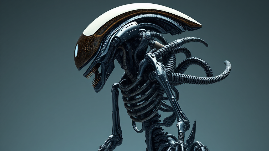 Alien-cyborg fusion, intricate exoskeleton, blend of organic bones and sleek metal, minimalist backdrop, hyper-realistic detail, photorealism in 8k, crafted with advanced 3D rendering, enhanced using unreal engine; vertical orientation with expressive style and subtle artistic flair, maintaining vivid and captivating details.
