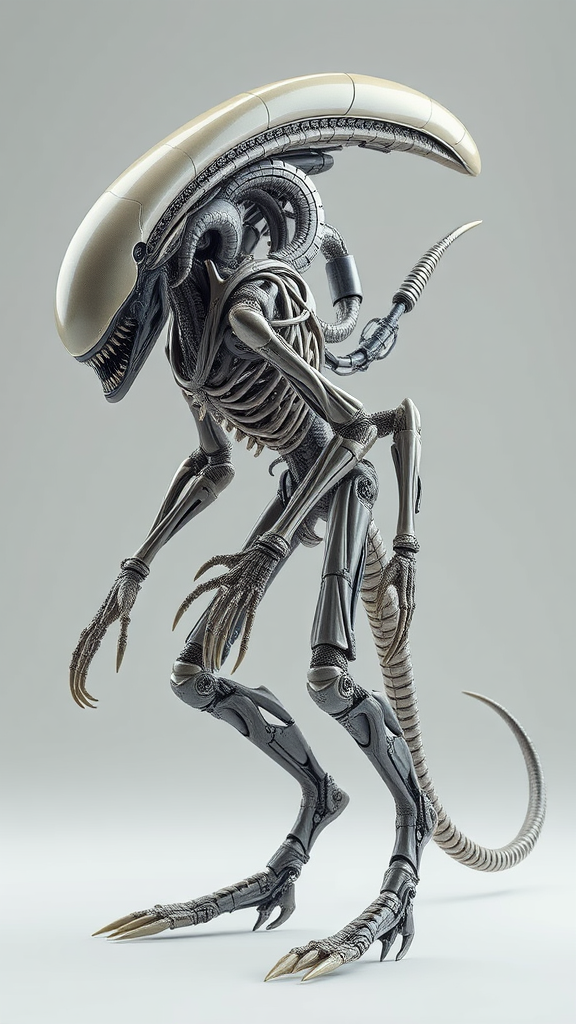 Alien-cyborg fusion, intricate exoskeleton with interwoven bones and metallic components, set against a minimalist background, hyperrealistic and photorealistic details, rendered in 8k resolution using unreal engine, 3d model showcasing intricate textures, stylized with expressive elements, smooth and dynamic design, subtle luminescence highlighting futuristic elements.