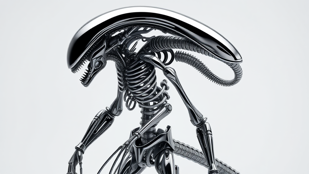 Alien-cyborg fusion, seamless blend of organic and mechanical elements, intricate exoskeleton design, synthetic bones intertwined with polished metal, minimalist background, striking hyperrealism, photorealistic detail, 8k resolution, advanced 3D rendering, surreal yet lifelike, dynamic and vivid style, maximum sharpness and clarity.
