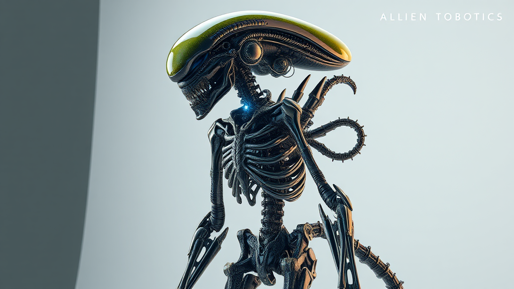 Alien-cyborg fusion with intricately detailed exoskeleton featuring both organic bones and metallic elements, set against a minimalist background, rendered in hyperrealistic 3D with photorealistic textures, in 8k resolution, utilizing advanced render technology for a vivid and expressive style, showcasing dynamic light interplay and intricate details