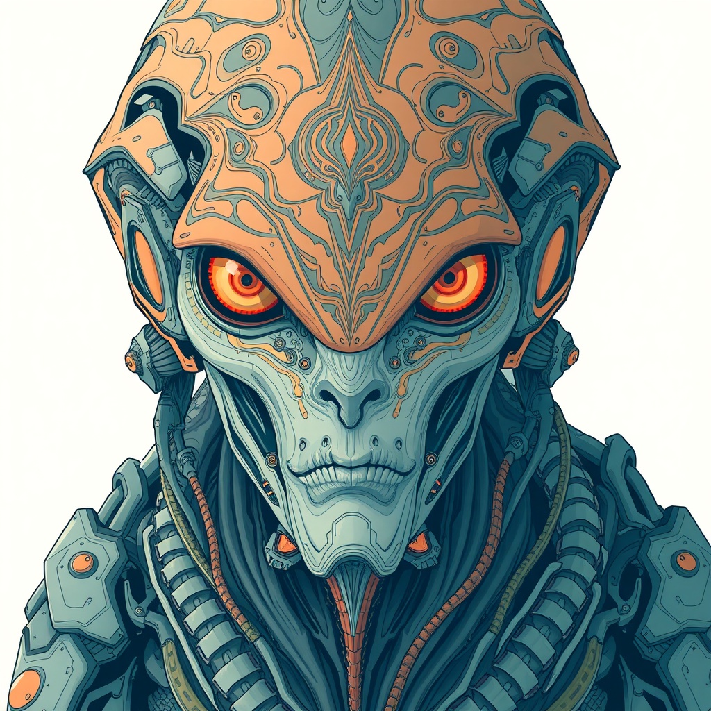 View this AI-generated image featuring alien cyborg illustration by theo el featuring balanced symmetry intricate light orange and cyan hues detailed facial features with a manticore influence organic forms and muted tones the artwork showcases meticulous portraiture with complex patterns blending b