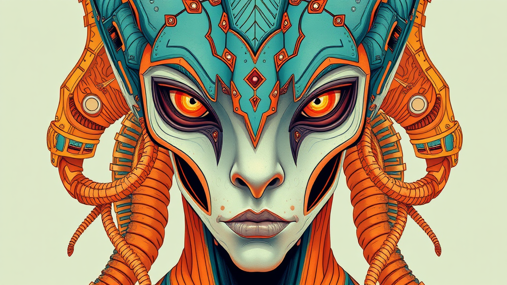 Alien cyborg illustration inspired by Theo El, featuring balanced symmetry and detailed facial features, with a manticore influence in organic forms. The color palette includes light orange and cyan in muted tones, showcasing meticulous portraiture with complex patterns. The artwork embodies a harmonious blend of technology and nature, with intricate details and a stylized touch, resulting in a captivating, otherworldly aesthetic.