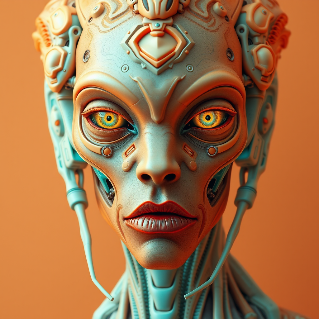 Alien cyborg portrait inspired by Theo El, featuring balanced symmetry with a manticore influence. Utilize light orange and cyan tones, highlighting detailed facial features and organic forms. Employ muted tones and meticulous portraiture to create complex patterns, maintaining a sense of harmony. Aspect ratio 1:2, with a stylized approach and intricate detailing.