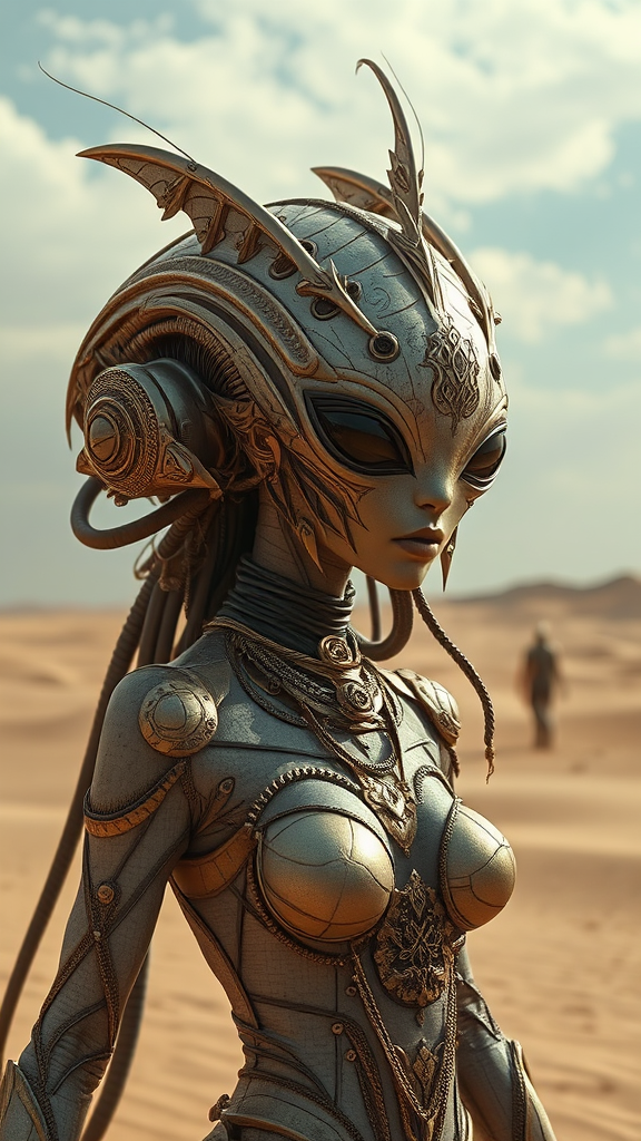 Alien desert creature in high-definition art, characterized by futuristic glamour with dark beige and gold tones, featuring a low depth of field. The style incorporates solarpunk elements with surrealistic poses under expansive skies, creating a captivating scene. An alien woman traverses the desert, with the aesthetic of intricate spacecraft designs. The scene showcases highly detailed figures with a focus on depth of field, influenced by craola art style, featuring light bronze and gold hues, and realistic figures throughout.