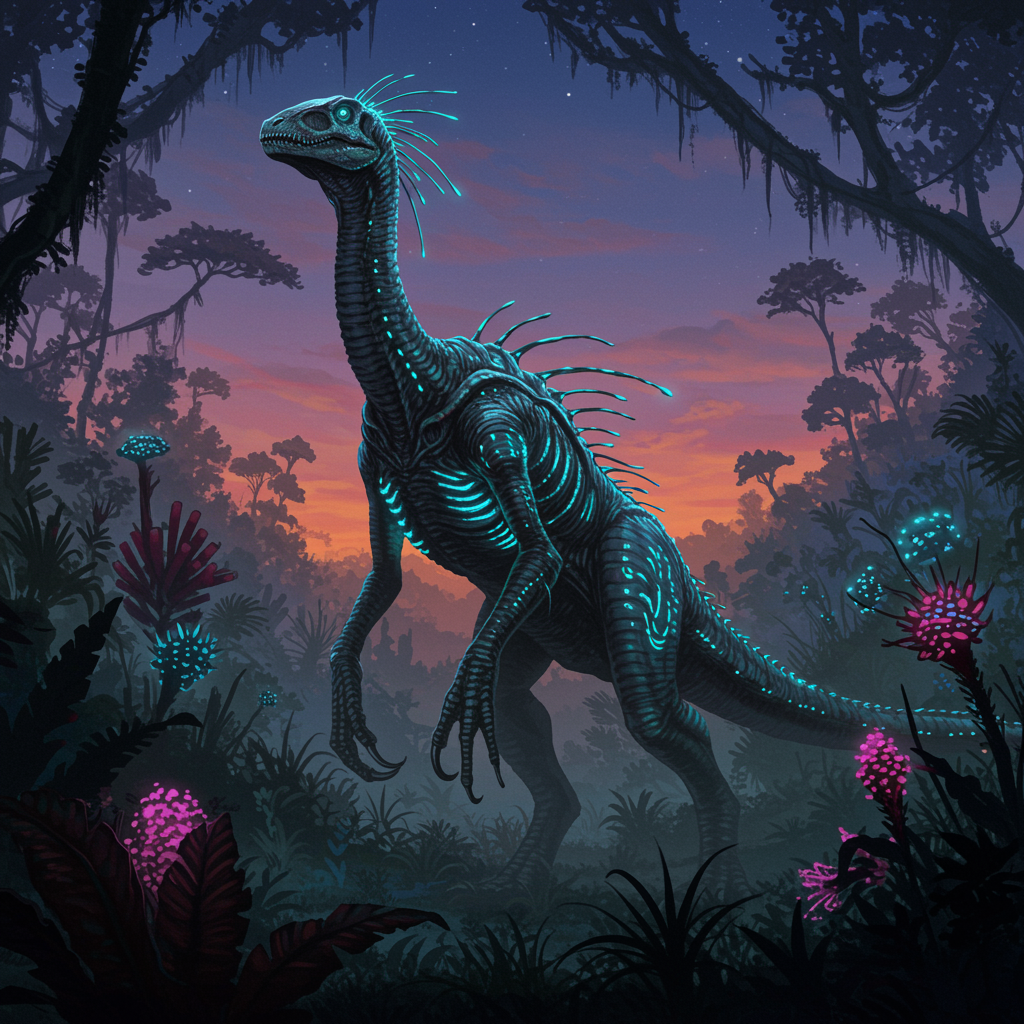 View this AI-generated image featuring alien dinosaur towering against a twilight sky scales shimmering with iridescent hues elongated limbs and a labyrinth of bioluminescent patterns pulsing across its body set in a lush otherworldly jungle with plants of surreal shapes and colors shrouded in a mys
