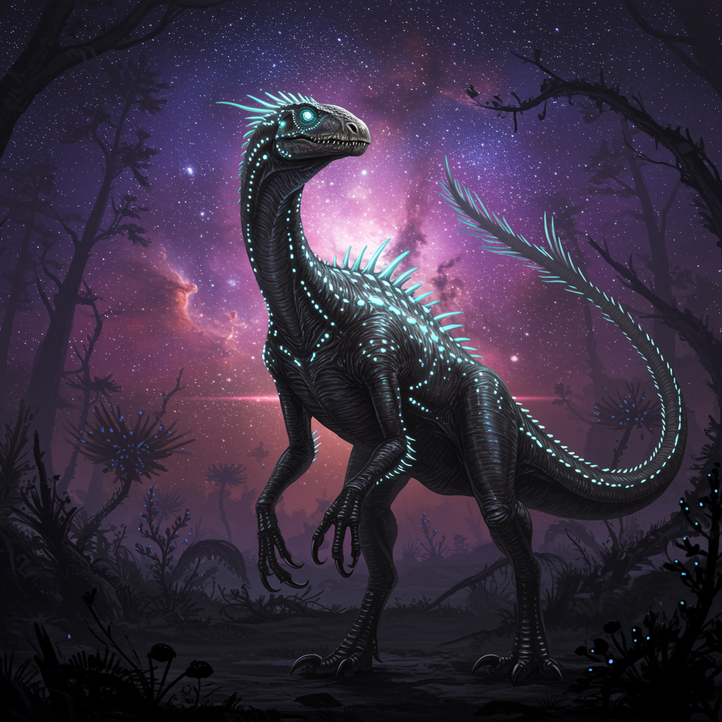 Alien dinosaur with elongated limbs and luminescent scales, towering against an otherworldly landscape under a vibrant nebula sky, intricate patterns shimmering across its hide, eyes glowing with an enigmatic intelligence, an ancient forest of peculiar alien flora in the background, hinting at a prehistoric yet futuristic world.