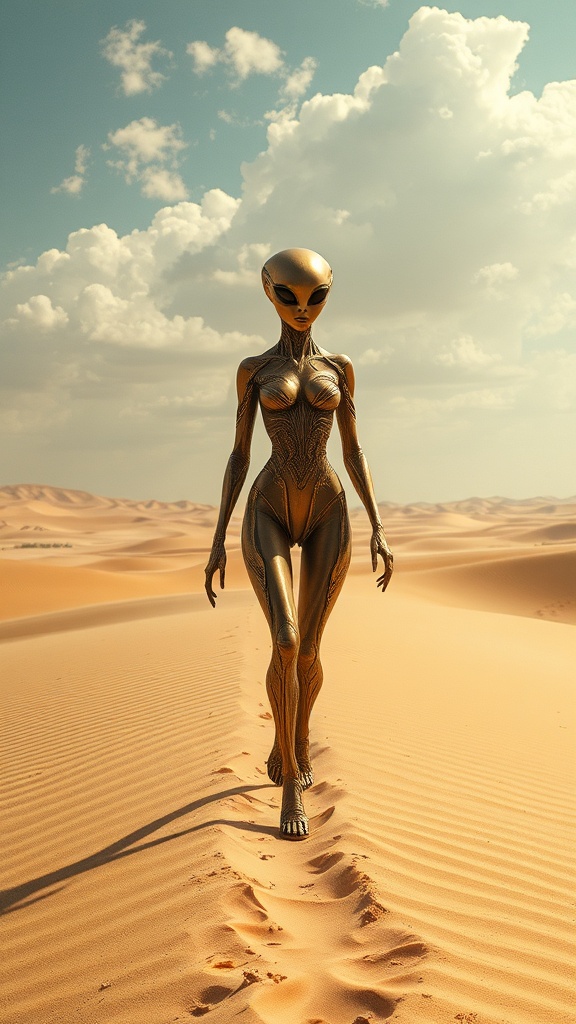 Alien entity traversing desert landscape, exuding futuristic elegance, dark beige and lustrous gold tones. Immersed in solarpunk themes with surrealistic stances beneath vast skies. An extraterrestrial female figure strides across the sands, echoing the grandeur of intricate spacecraft designs. Features are impeccably detailed, highlighting a blend of light bronze and gold hues. The scene is imbued with a dreamlike quality, emphasizing realistic yet ethereal characteristics.