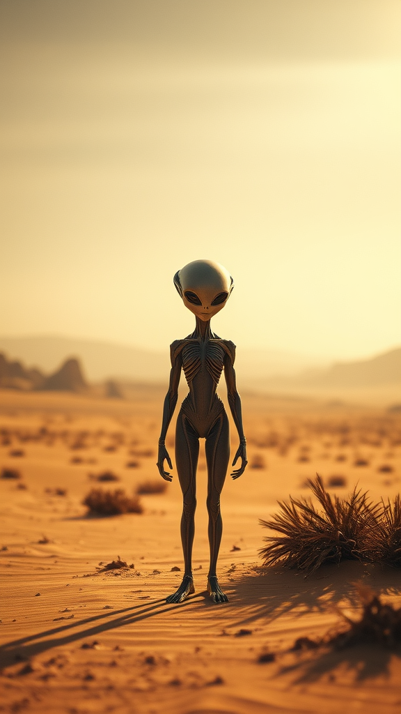 Alien entity in a desert landscape, featuring futuristic elegance, dark beige and golden hues, shallow depth of field, solarpunk influence, surreal and dynamic stances, vast and mesmerizing skies, enchanting atmosphere --v 5.2.