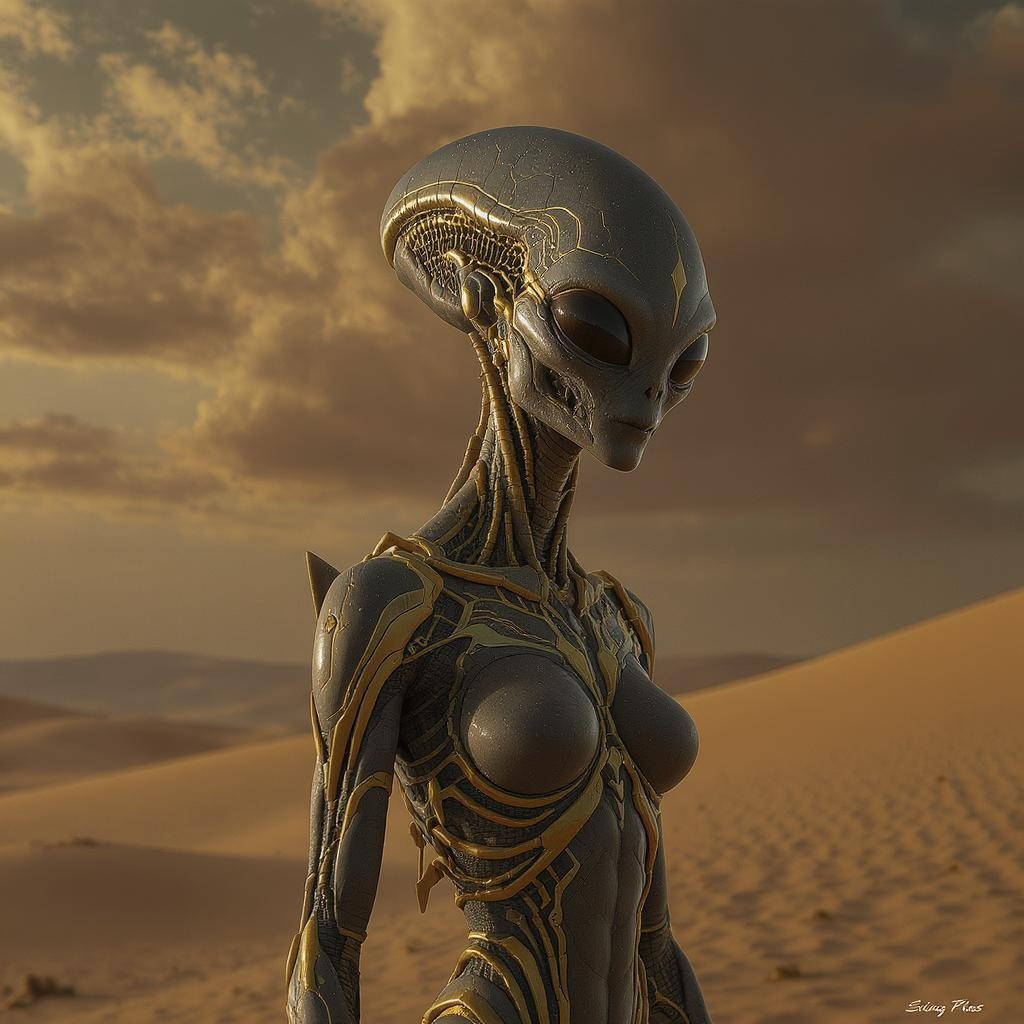 Alien entity in a desert landscape, rendered in high definition, embodying futuristic elegance with dark beige and gold hues. The setting features a low depth of field, blending solarpunk aesthetics with surrealistic poses. The creature is set against vast, mesmerizing skies, offering a captivating visual experience.