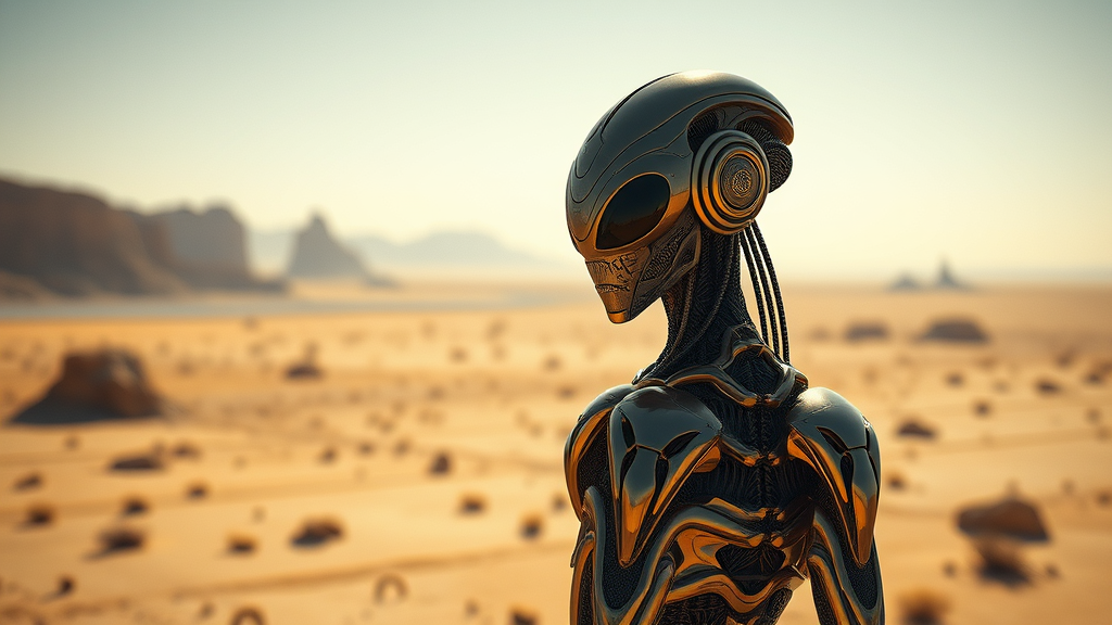 alien entity in arid landscape art hd, featuring futuristic elegance, dark tan and shimmering gold, shallow depth of field, solarpunk influence, surreal postures, vast horizons, mesmerizing atmosphere