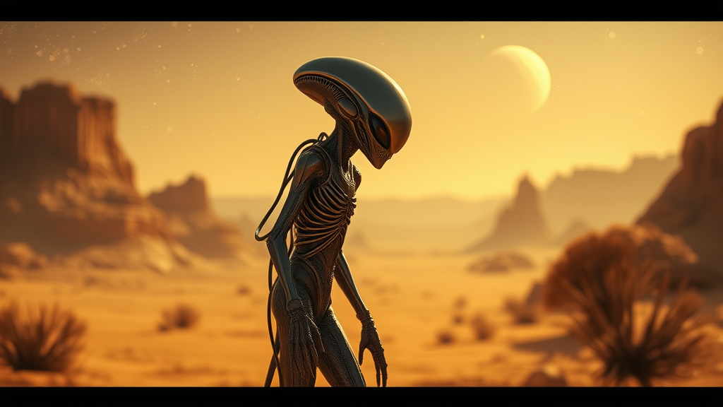 Alien entity in desert landscape art HD, crafted in futuristic elegance, hues of deep tan and shimmering gold, shallow depth of field, solarpunk elements, dreamlike stances, vast celestial skies, mesmerizing atmosphere, version 5.2 influences.