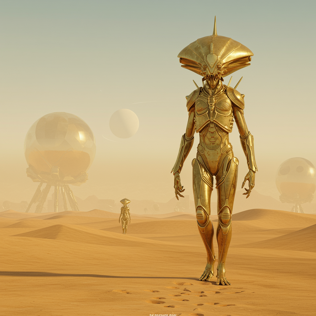 View this AI-generated image featuring alien entity roaming a sandy wasteland depicted in vibrant futuristic elegance tones of dark beige and gold dominate giving it an ethereal glow a low depth of field enhances its presence against a solarpunk backdrop of surreal postures an endless sky stretches