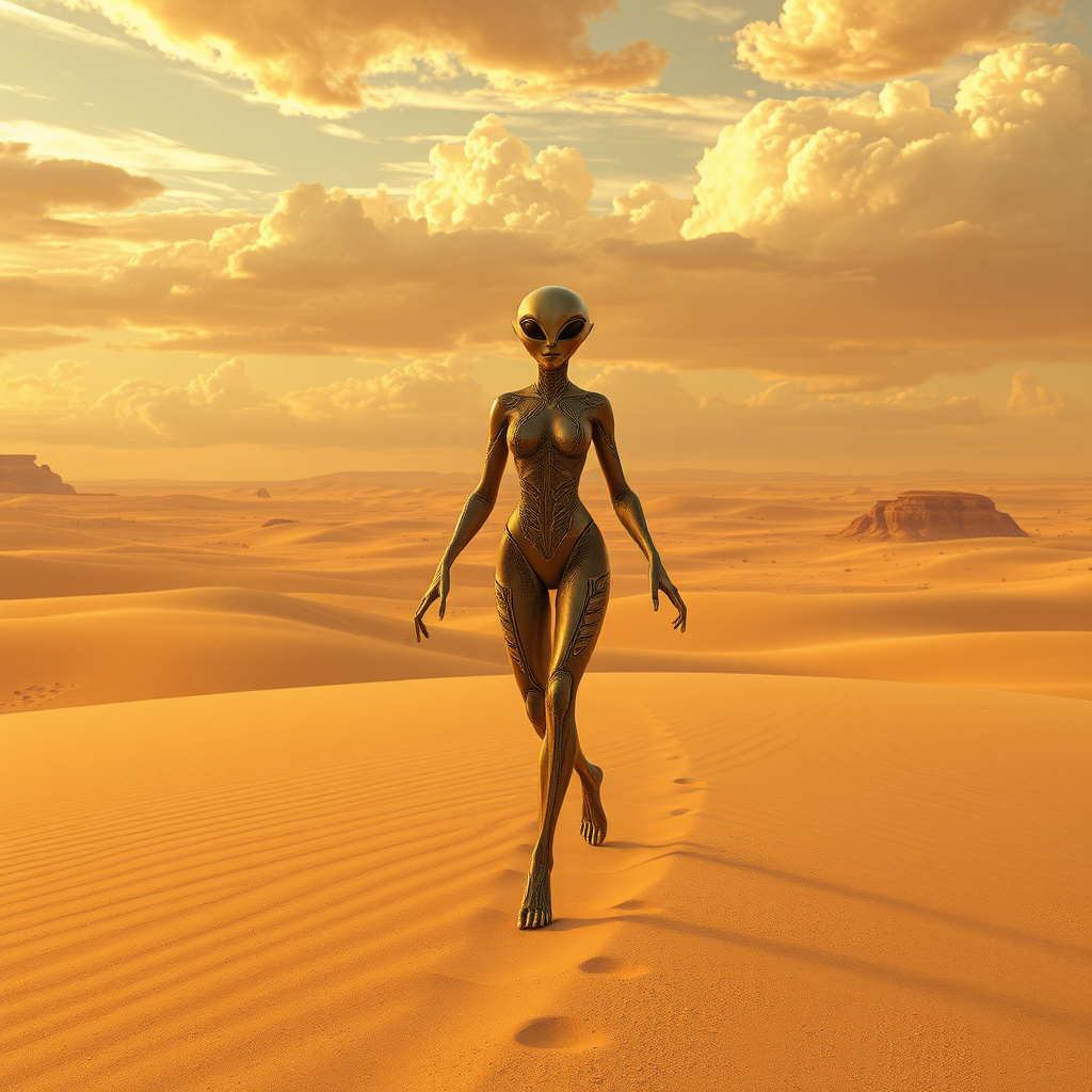 Alien figure traversing a desert landscape, characterized by futuristic elegance, muted beige and shimmering gold tones; under expansive, mesmerizing skies. The scene captures a solarpunk essence with surreal body language. An alien woman strides with grace, evoking the design of intricate spacecrafts. The depiction is rich in detail, with a focus on depth, using a palette of light bronze and gold hues. The figures boast a realistic aesthetic, reminiscent of craola style, merging elaborate artistry with a vivid sense of realism.