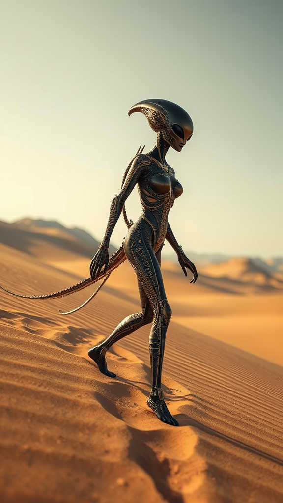 Alien figure traversing the desert landscape, styled with futuristic elegance, dark sand tones and shimmering gold accents, shallow depth of field, solarpunk aesthetics, surreal yet graceful posture, vast open skies, captivating presence; an extraterrestrial woman journeying across the desert, blending with intricate spacecraft design, meticulously detailed appearance, soft depth of field, imaginative style, light bronze and golden hues, lifelike portrayal.