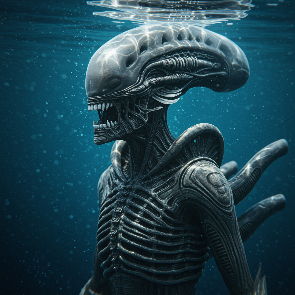 Alien Hans Giger full body, exquisite face, stunning features, impeccable physique, intricate details, photorealistic masterpiece by Aaron Horkey and Jeremy Mann, submerged underwater with bioluminescent accents, surreal textures, ethereal ambiance, delicate play of light and shadow, fluid grace.