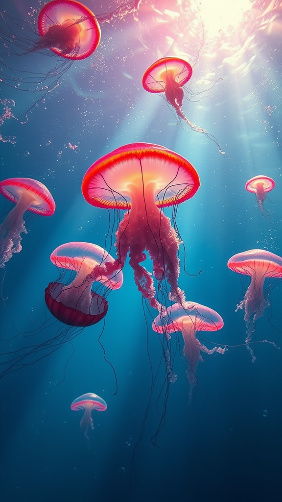 Alien jellyfish drifting serenely through a surreal oceanic realm, exuding an aura of sci-fi wonder. Vivid colors illuminate their translucent forms as dramatic god rays pierce through the water, casting an ethereal glow. Eerie yet captivating, the scene is alive with the shimmer of underwater particles and bubbles. A truly fantastical underwater world, capturing a harmonious blend of vivid colors and ultra-high-definition detail.