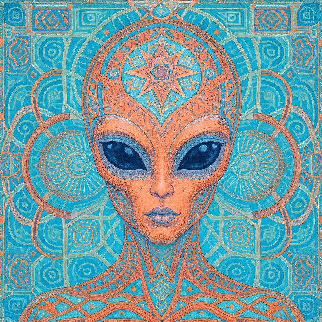 Alien portrait art in harmonious symmetry, featuring a palette of soft oranges and vibrant cyan, showcasing intricate facial details and precise portraiture. Incorporate elaborate patterns that weave seamlessly throughout, emphasizing complex, geometric designs.