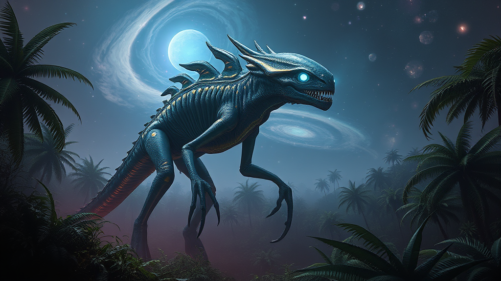 Alien prehistoric creature inhabiting an otherworldly jungle, towering with elongated limbs and iridescent scales, adorned with bioluminescent patterns that pulse in rhythm with the planet’s heartbeat, eyes glowing with an eerie intelligence, set against a backdrop of swirling nebula skies, evoking a sense of primordial majesty.