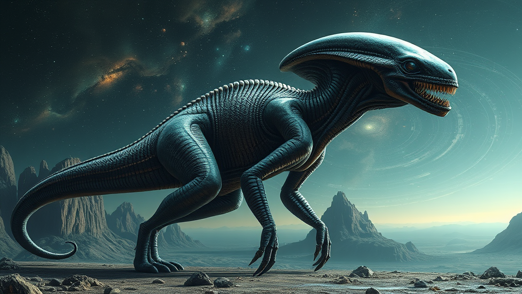 Alien prehistoric creature, towering and majestic, set against a surreal landscape with an elongated silhouette. Its skin is textured and iridescent, shimmering with colors unseen on Earth, featuring intricate patterns resembling celestial constellations. Eyes are luminous, casting a gentle glow, while its elongated limbs tread softly on the unfamiliar terrain. In the background, an otherworldly sky filled with swirling nebulae and distant stars completes the ethereal scene.