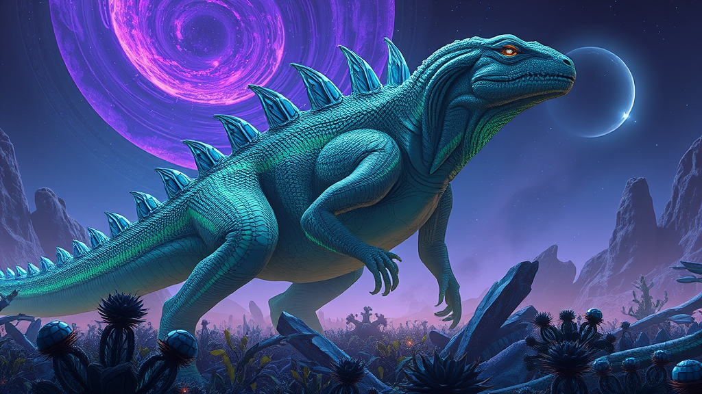 Alien reptilian creature towering over a futuristic landscape, its massive form reminiscent of a dinosaur yet bearing otherworldly features; bioluminescent scales shimmer in hues of green and blue, under a night sky filled with swirling purple nebulae; sharp, crystalline spines run along its back, blending seamlessly with the iridescent environment; its eyes glow with an enigmatic intelligence, casting an ethereal light over the alien vegetation beneath.