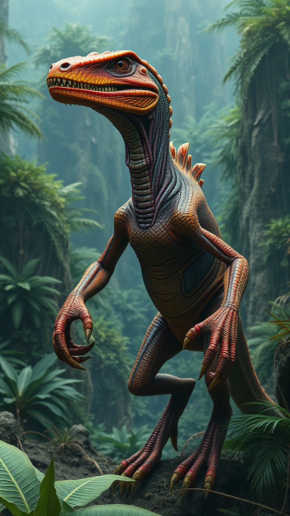 Alien reptilian creature with dinosaur-like features, set in a towering jungle landscape, vivid colors with scaly textures, elongated limbs and extraterrestrial markings hinting at an otherworldly origin, vertical orientation, raw and unrefined style.