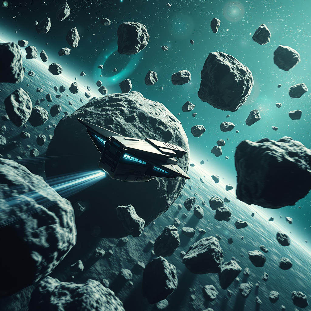 Alien spacecraft navigating dense asteroid belt, detailed cosmic scene, small nimble spaceship skillfully dodging tumbling asteroids, vast cold void, drifting meteorites, twinkling distant stars, ethereal gas nebulae, in the style of BelleDeesse, integrating a touch of surreal luminosity and subtle motion blur for added dynamism.