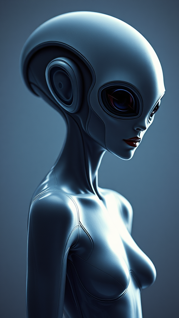 Alien women character, ethereal minimalist cosmic female entity alluring, complete form, captivating, graceful, affection, endearing, fervor, allure, poised majestic stance, graceful, influenced by Daft Punk, artistic style inspired by Roger Fry & Gaston Le Touche.