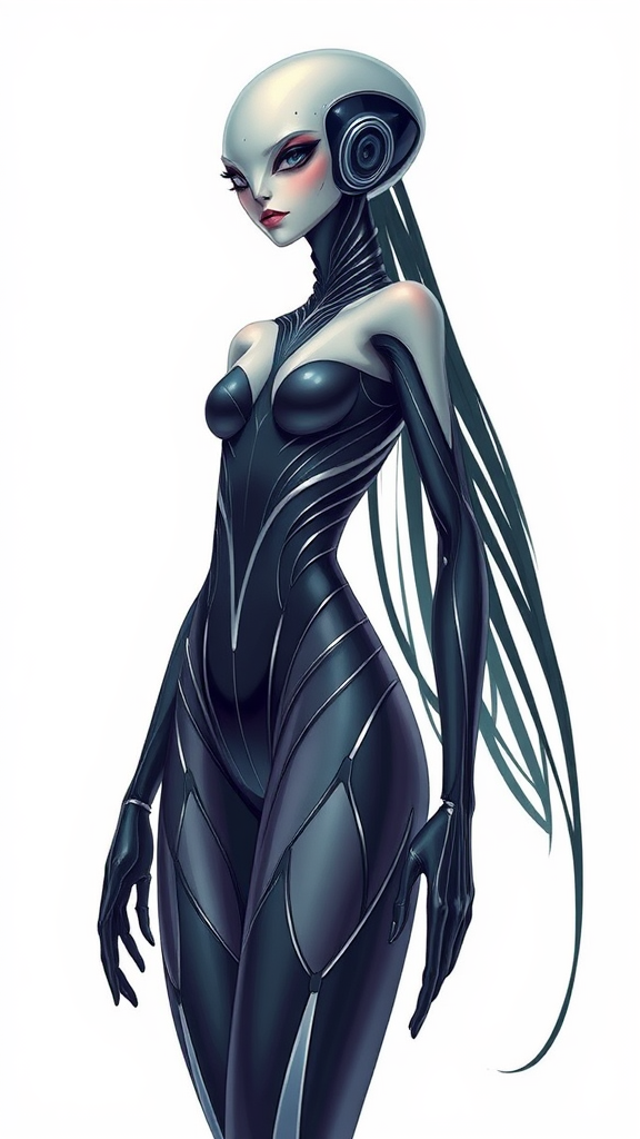 Alien women character, with an elegant minimalistic cosmos allure; a full-body depiction revealing an attractive, feminine essence imbued with love, charm, and beauty; exuding passion with a cute yet sophisticated demeanor. She stands in an epic elegant pose, merging the futuristic elements reminiscent of Daft Punk with the art styles of Roger Fry and Gaston Le Touche. Her features are ethereal and refined, capturing a cosmic elegance that speaks of both mystery and allure.