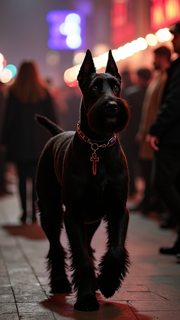 A sleek, all-black giant schnauzer trots gracefully beside its fashionable owner, weaving through the vibrant crowd at a NYC Fashion Week soirée, where an eclectic mix of stylish attendees flaunt their avant-garde ensembles under the city's dazzling lights.