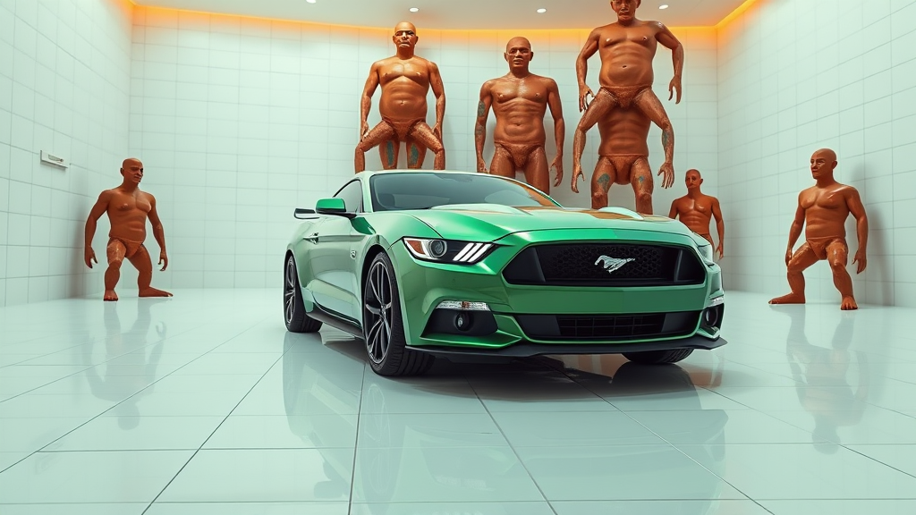 All white tiled room, a metallic green Ford Mustang parked prominently, the scene infused with perfect orange hues and bright lighting, pastel colors creating a dreamy ambiance, with insanely detailed features captured in 8k resolution, ultra-realistic commercial photography showcasing professional color grading, amidst towering figures with stacked torsos resembling a totem pole, featuring distorted anatomy with extra limbs, missing limbs, and floating appendages, creating a surreal landscape of disconnected and mutated forms, evoking a sense of unease with its ugly, blurry, and disgustingly fascinating imagery.