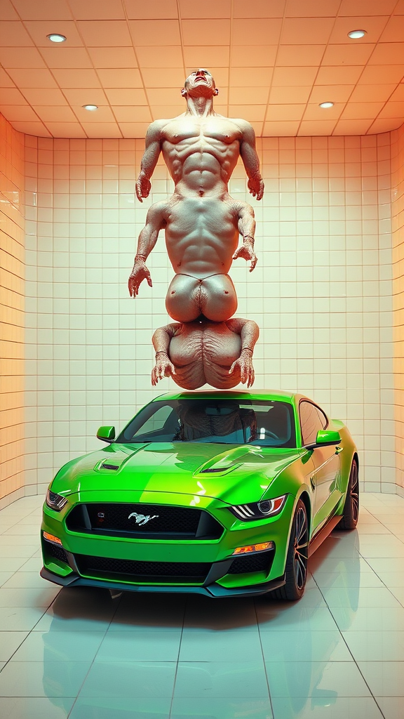 All white tiled room, metallic green Ford Mustang, vibrant orange hues, bright illumination, pastel-colored accents, intensely detailed, fine intricacies, 8k resolution, ultra-realistic, high-end commercial photography, expertly graded colors, stacked torsos resembling a totem pole, with distorted anatomy, featuring extra, missing, and floating limbs, disconnected body parts, mutations, unsettling and blurry elements, reminiscent of an abstract and surreal composition.