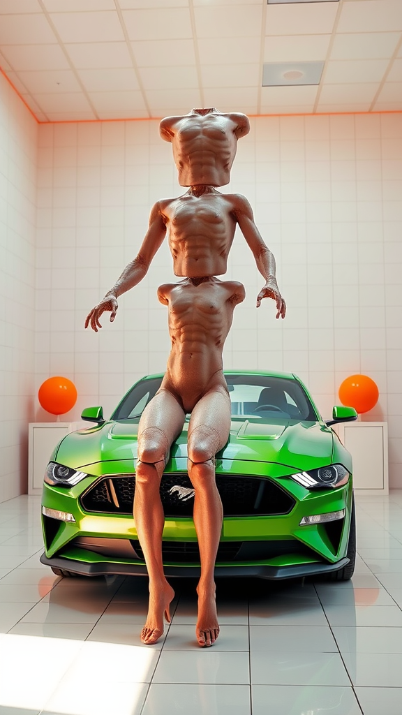 All white tiled room, metallic green Ford Mustang, vibrant orange accents, bright lighting, soft pastel colors, intricately detailed, highly refined, ultra-realistic, captured in 8k, commercial photography with expert color grading, surreal composition with stacked torsos, totem-like structure, abstract anatomy, peculiar forms, extra and missing limbs creating a floating, disconnected illusion, visually arresting mutations, unsettling yet captivating, blurred edges, unexpected amputation, artistic interpretation of distortion and transformation.