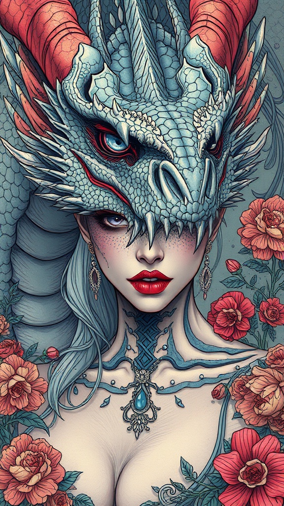 View this AI-generated image featuring alluring dragonborn female central focus striking visual elaborate meticulously detailed stunning elegance sharp linework vivid palette cinematic depth inspired by carne griffiths and conrad roset aesthetics. Created using advanced AI technology, this image sho
