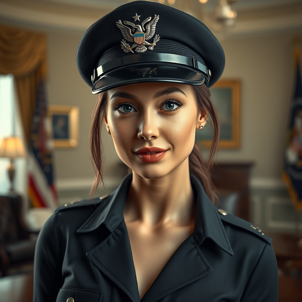 Alluring woman dressed as a U.S. officer, wearing an officer's cap, set against the backdrop of an American president's office, making direct eye contact with a playful expression, beautifully detailed skin, photo-realistic, high-resolution portrait photography, expertly crafted 3D model, showcasing realistic textures and colors. The scene is lit with soft, diffused lighting, achieving a warm and inviting atmosphere, focused precision with a shallow depth of field to enhance realism. Attention to lifelike detail and cinematic lighting creates a hyper-realistic effect, minimizing visual noise and errors seen in low-quality images. The composition highlights proportional anatomy and maintains the intended aesthetics without distortions or inaccuracies.