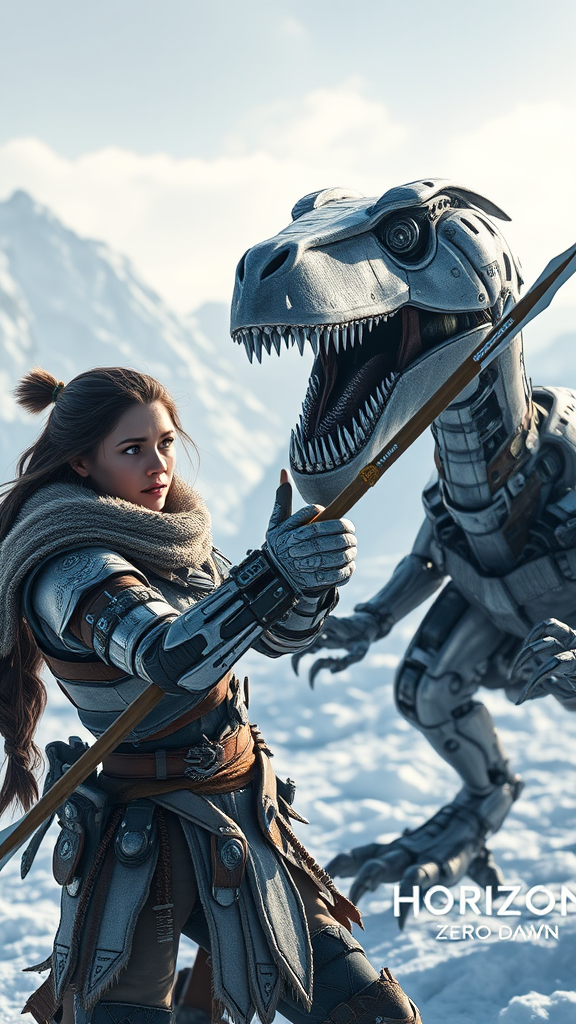 Aloy from Horizon Zero Dawn stands amidst the snowy Norse mountains, engaged in fierce combat with a menacing robotic raptor. The scene is captured with hyper-realistic detail, showcasing the icy terrain and the intricate design of both Aloy and the raptor. The environment is rendered with HDR, ray tracing, and octane technology, resulting in lifelike lighting and shadows. Aloy's face is depicted with extreme detail, with emphasis on her expressive eyes and determined expression. Her hands and arms are skillfully modeled, as she wields a detailed spear with precision. The robotic raptor is portrayed with intricate mechanical features, its metallic surface glistening in the cold light. Creative elements enhance the narrative, such as subtle adjustments to Aloy's armor to blend seamlessly with the snowy landscape. The overall composition maintains clarity and focus, free from distractions like floating limbs or abnormal anatomy.