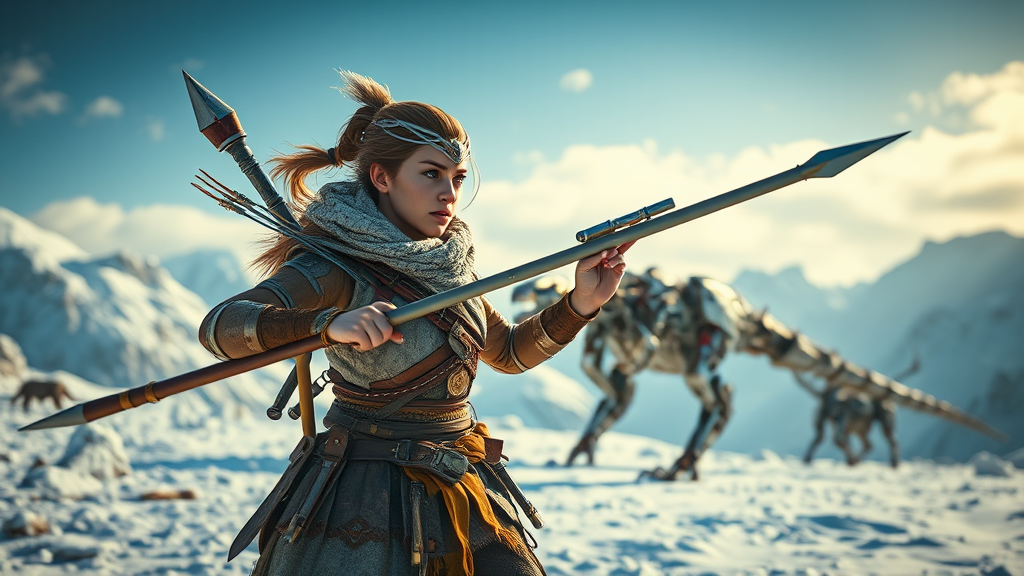 Aloy from Horizon Zero Dawn stands fiercely in the snowy Norse mountains, wielding her spear as she faces a robotic raptor. The scene is hyper-realistic, showcasing detailed features of Aloy’s face, eyes, hands, and arms. The robotic raptor is intricately designed, capturing its mechanical essence. The environment is brought to life with HDR, raytracing, and ultra-realistic rendering, using technologies like Octane render, UE5, and Autodesk 3D. The atmosphere is tense and immersive, accentuated by extreme detail and precision throughout the depiction, highlighting her powerful stance and the raptor's menacing presence.