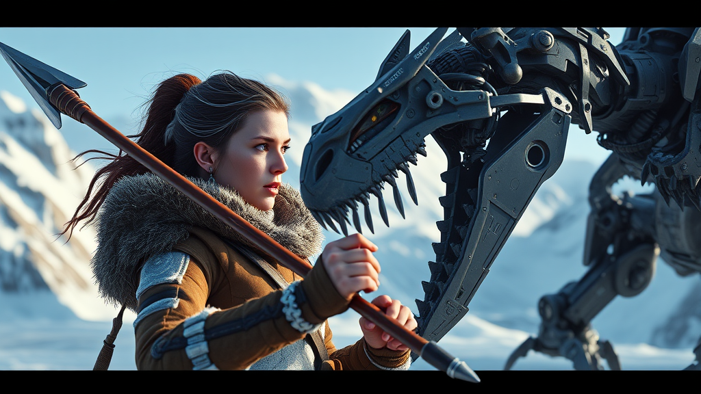 Aloy from Horizon Zero Dawn stands in the snowy Norse mountains, engaged in battle with a menacing robotic raptor. The scene is captured in hyper-realistic detail with ultra-realistic textures, emphasizing the crispness of HDR and raytracing effects. The octane render and UE5 technologies, along with Autodesk 3D rendering, bring the scene to life with extreme detail. Aloy's expression is fierce, showcasing detailed facial features and piercing eyes. Her hands grip a finely detailed spear with precision, showcasing every muscle and joint. The robotic raptor is equally detailed, with intricate mechanical components visible in its design. The setting is rich with atmospheric effects, enhancing the scene without any distortion or quality issues. The lighting highlights the drama of the encounter, avoiding any deformed or poorly rendered elements, and fully immerses the viewer in the high-stakes confrontation.
