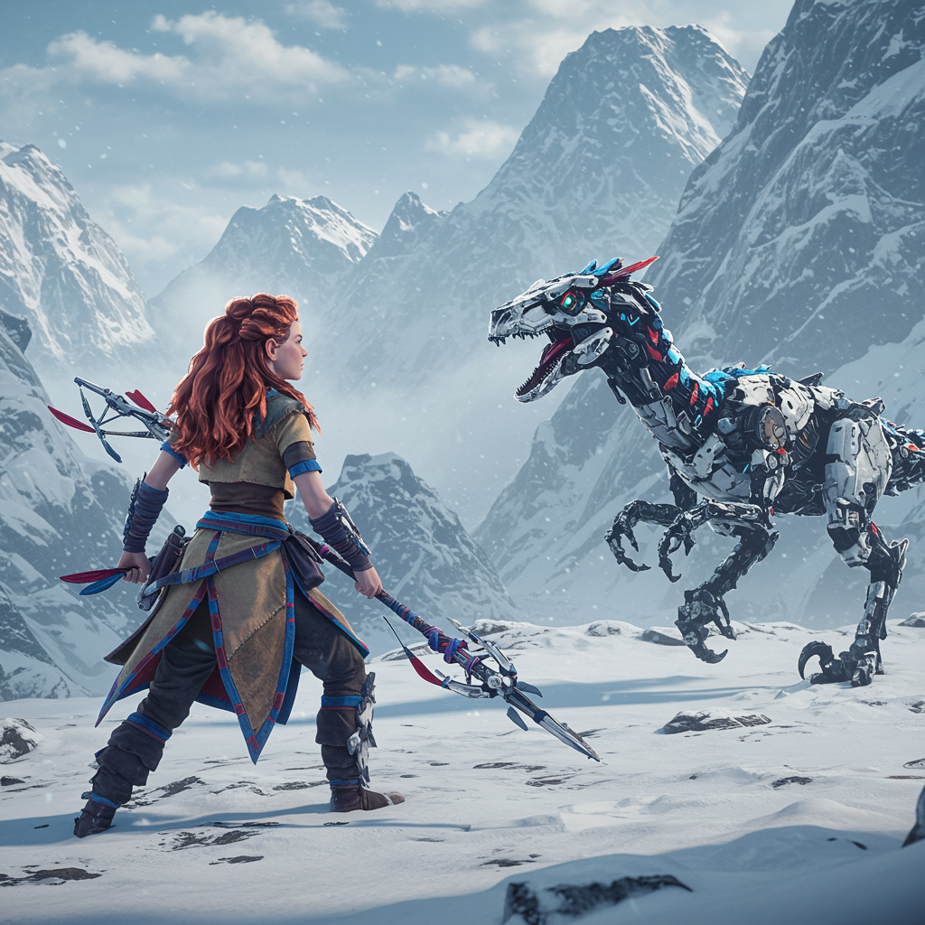 Aloy from Horizon Zero Dawn stands poised in the snowy Norse mountains, her fierce gaze fixed on a menacing robotic raptor. The scene captures hyper-realistic and ultra-realistic details, enhanced with HDR and raytracing. The landscape is rendered with extreme precision, the snow glistening under a crisp, digital sky. Aloy's features are finely detailed, her face and eyes conveying intense focus. Her hands grip a beautifully crafted spear with intricate designs, poised to strike. The robotic raptor is depicted with extraordinary detail, its mechanical components gleaming under the virtual light. The mountains serve as a dramatic backdrop, rendered with autodesk 3D and in the high fidelity of UE5. Despite the inherent danger, there's an artistic harmony in the confrontation, a clash of nature and technology.