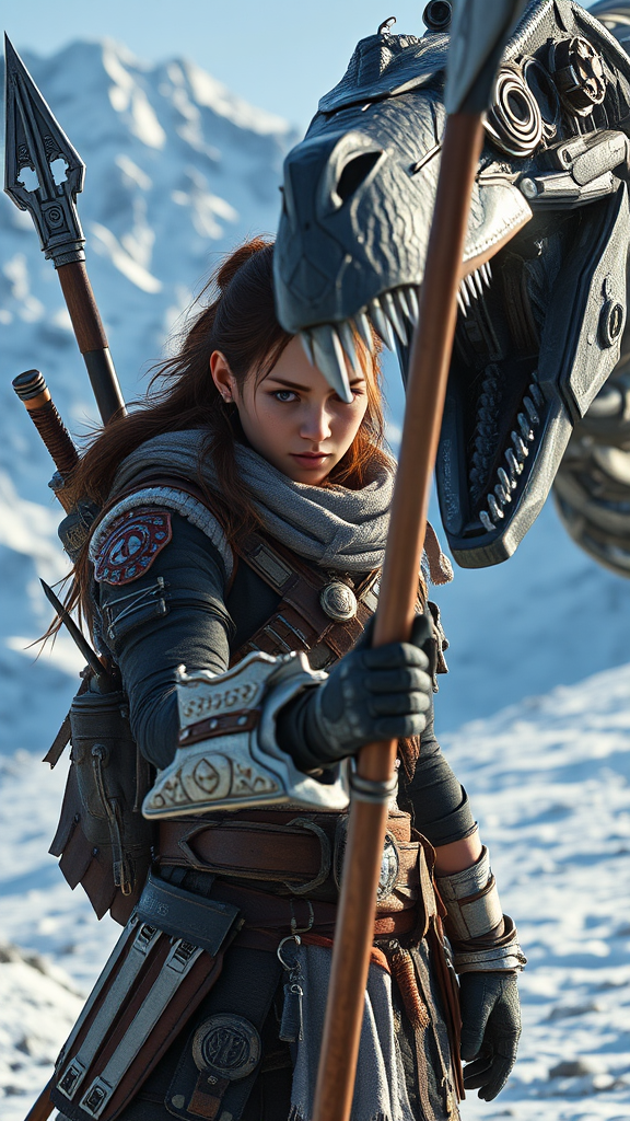 Aloy from Horizon Zero Dawn stands resolute in the snowy Norse mountains, engaged in battle with a menacing robotic raptor. The scene is hyper-realistic, emphasizing ultra-realistic textures and intricate details throughout. With HDR lighting and the power of raytracing, every element comes to life, as if rendered with Octane and Unreal Engine 5.0 for an immersive experience. The detailed render captures Aloy's focused expression, her eyes sharp and determined. Her hands grip a meticulously crafted spear, every facet detailed down to the texture of the metal and the fine grain of wood. The robotic raptor is depicted in extreme detail, showcasing its complex mechanisms and futuristic design. The environment is painted with extreme detail, highlighting the frosty mountains and the shimmering snow. Despite the hyper-realism, the scene retains an artistic touch, creating a visually stunning portrayal of this epic confrontation.